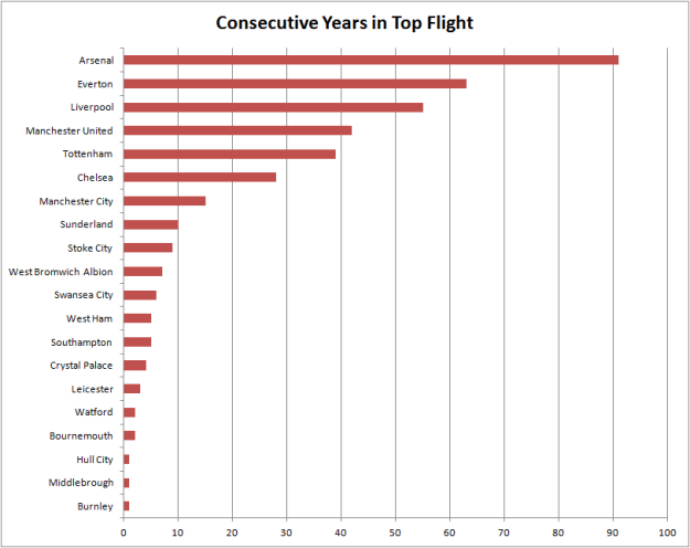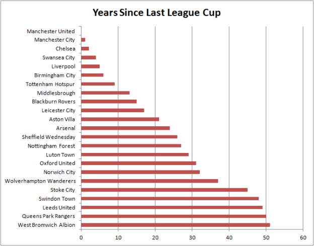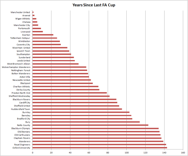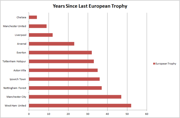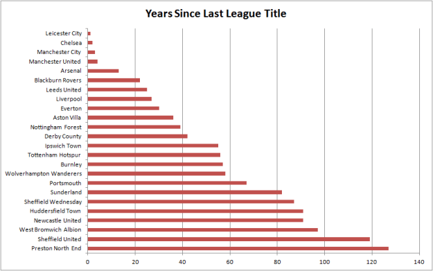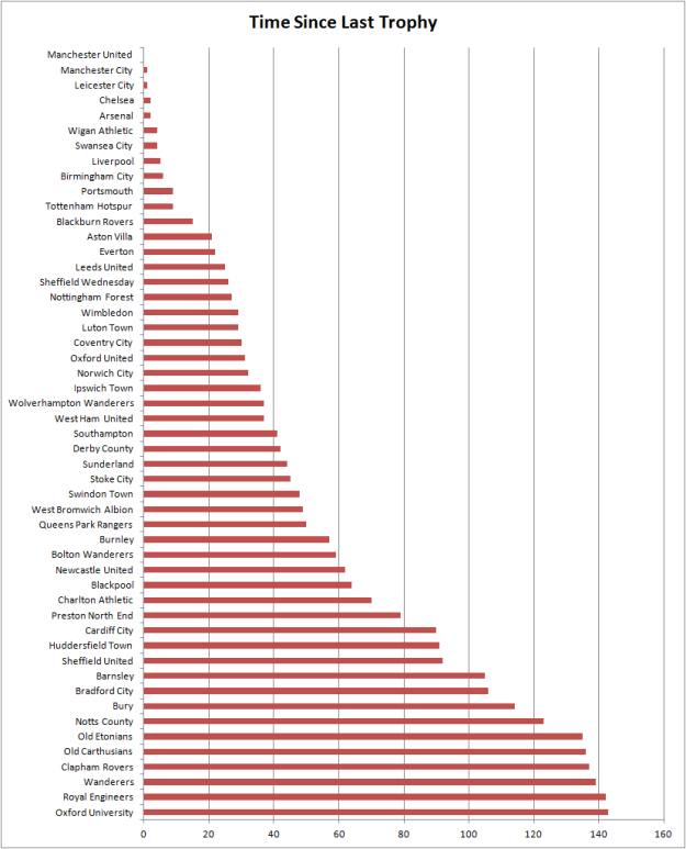 No other side in English football has their Years since they won something documented as much as Arsenal. So I put together a little bar chart. And this then expanded to a few more bar charts. Some of you might find it interesting reading. Others will probably say I am just trying to deflect from the criticism of Arsene Wenger and justify our failures using other clubs failures.