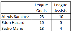Alexis Sanchez has been vastly superior to both Hazard and Mane. How Mane especially has got in ahead of Sanchez is nothing short of disgraceful and shows how people are influenced by the “Liverpool love in” with the press – media outlets are reporting their great season, but they are just 1 point ahead of crisis hit Arsenal.