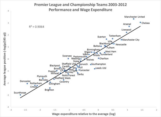 The below is a table which I first read in the book Soccernomics. A brilliant read for stats geeks like me. It shows a clear correlation between average league position and wage expenditure relative to the average. The more you spend, the higher your average league finish.