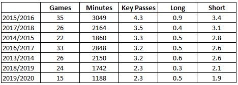 Mesut Ozil has been our chief creator this season, leading the way with 2.3 “key passes” per 90 minutes. But this output is his worst in an Arsenal shirt – and well below his Arsenal career high of 4.3 key passes per 90.
