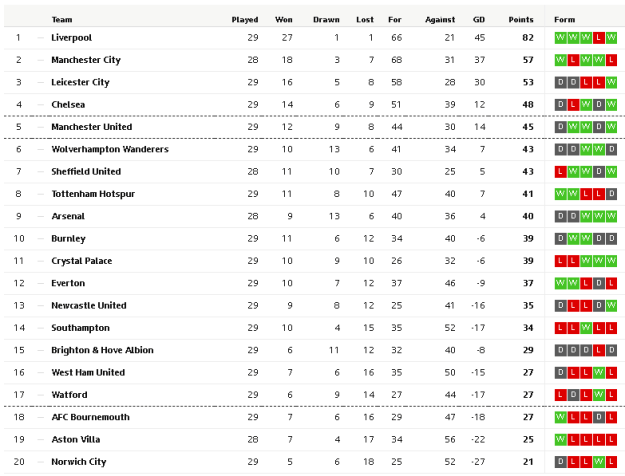 This would see Arsenal move above Tottenham into 8th, Sheffield United move above Wolves into 5th.