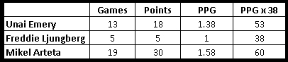 Would we have finished top 6 under Mikel Arteta had he been manager for the entire season? Well 60 points would have us in 6th place with a game to go, and we would actually have a chance to jump ahead Leicester on the last day of the season and finish in the Champions League.