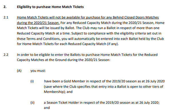 - For any Reduced Capacity Match during the 2020/21 Season, Home Match Tickets will be issued by Ballot
