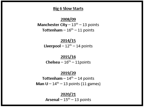 The way the press have gone on, you would think Arsenal’s slow start in the Premier League was the first time one of the so called “Big 6” had a sluggish start to the season.