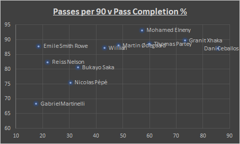 Not only are they the worst of the midfielders for keeping hold of the ball, but when it comes to pass completion ratio, they rank 25th and 27th out of 29. Only keeper Runar Alex Runarsson is worse than the pair, with Cedric Soares splitting them.