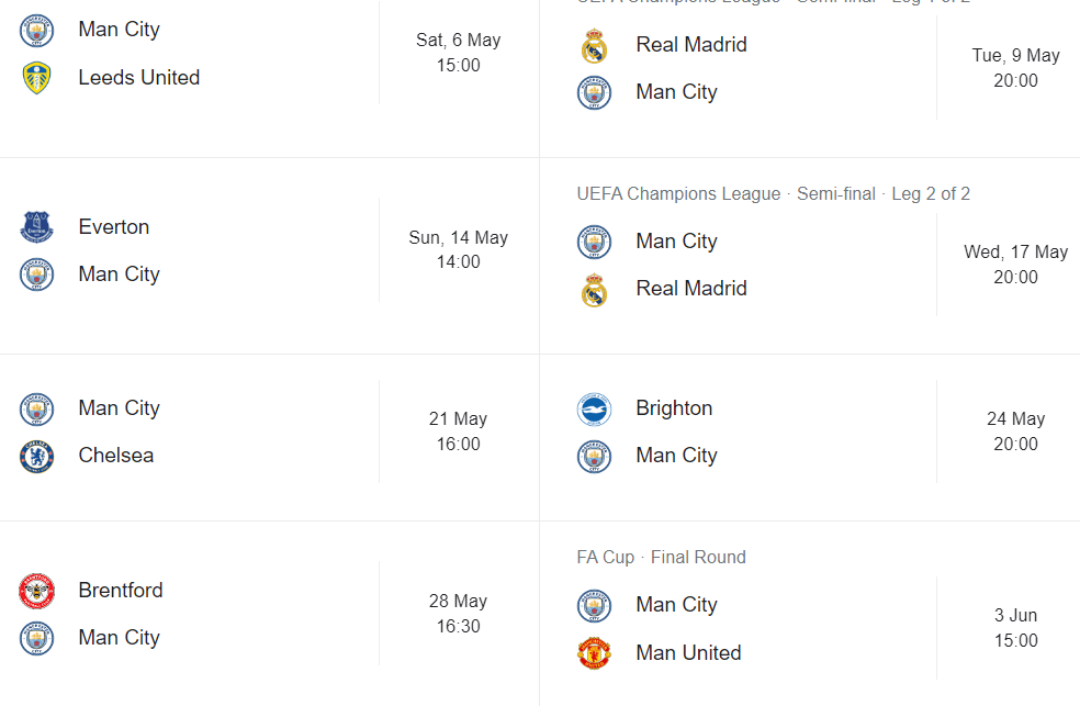 After this weekeend, City have some tricky fixtures, with 3 of their last 4 away. They play twice a week and have games interwined with those big Champions League games.