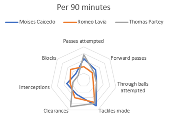 Again, the order is the same – Partey, Caicedo then Lavia. But Lavia is a lot closer to the paid than he was in the per 90 minutes comparison.