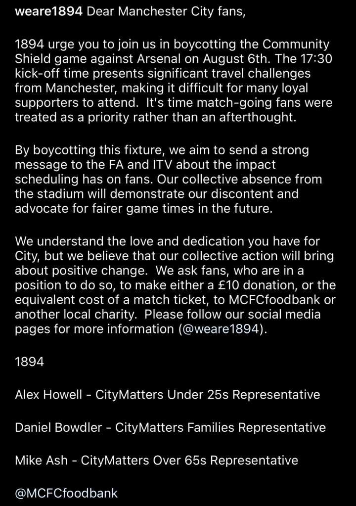 Manchester City supporter group WeAre1894 have called on City fans to boycott the Community Shield match against Arsenal on August 6th over scheduling. The have instead asked fans to donate to the MCFC Fans Foodbank other local causes.