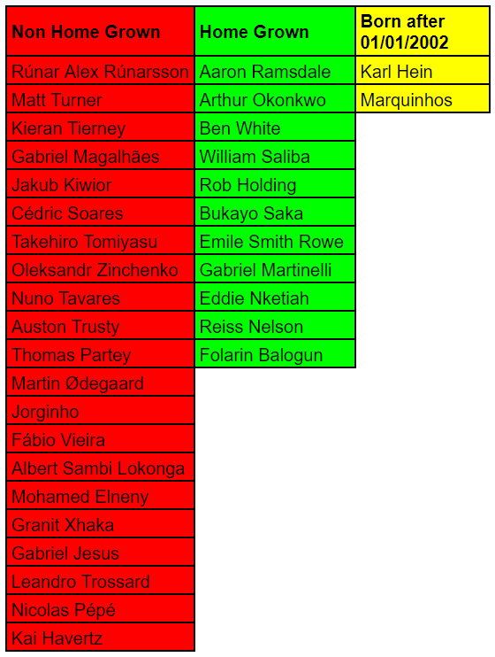 14 NHG players and 9 HG will give us 23 players registered. That then free’s ourselves up to sign Rice, Havertz and Timber without fear of leaving a player unregistered.