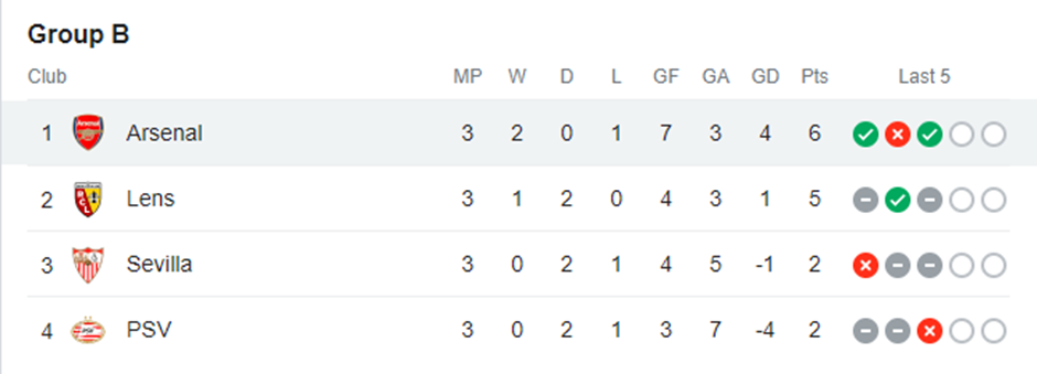 Those results will see Arsenal on 9, Lens on 8 and Sevilla and PSV on 2.