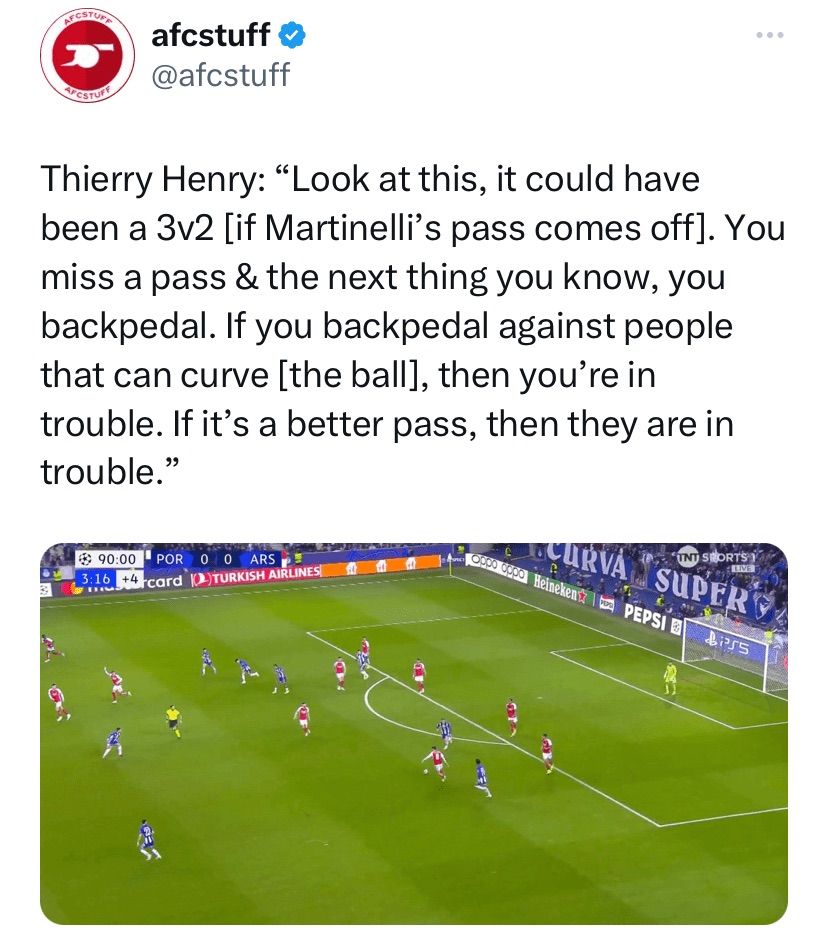 Thierry Henry once again provided the best analysis of the situation, pointing out had Martinelli’s pass hit the target we would have had a 3 on 2 and a good opportunity to go 1-nil up. With 6 men back, it there was very little risk in Martinelli playing that pass. 99 times out of 100 if it went to the opposition the loss of possession comes to nothing. This was the 1 in 100 where the misplaced pass led to a worldie strike.