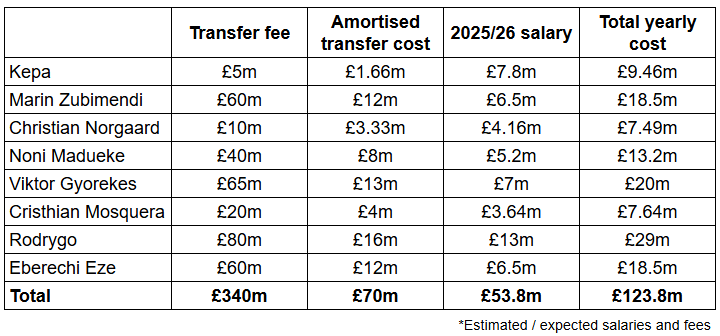 By my estimation (and official figures will differ), 8 new signings, £340m in transfer fee and their associated salaries will increase our outgoings by around £124m a year.