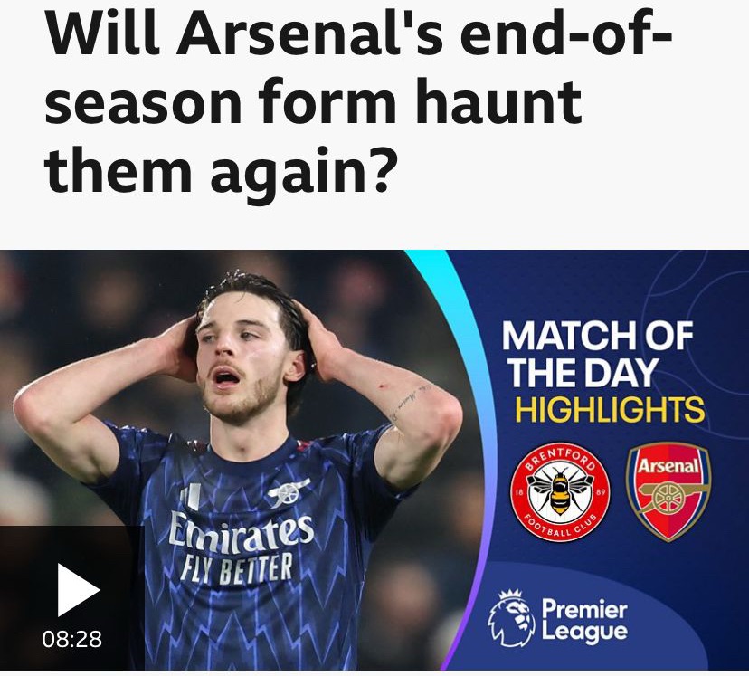It is interesting that the narrative is “will Arsenal’s end-of-season form haunt them again”. This really is lazy journalism from the BBC, fueld by “banter” social media accounts. It also continues to the recent trend of BBC Spot becoming more “casual” and”dumbed down” in their reporting to reach a new audience.
