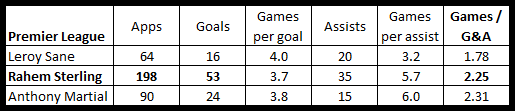 Sane is the stand out player when it comes to stats, but he also come to the Premier League as a more established player, where as Sterling broke through as a baby at Liverpool and Martial joining Manchester United as a teenager.