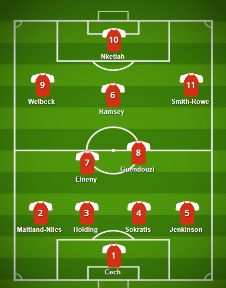 (4-2-3-1) Emiliano Martínez; Calum Chambers, Rob Holding, Shkodran Mustafi, Kieran Tierney; Lucas Torreira, Joe Willock; Reiss Nelson, Mesut Özil, Emile Smith-Rowe; Gabriel Martinelli.