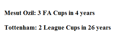 If I wanted to play silly buggers, I could say that Spurs have only won 3 trophies in the last 33 years. That my mates 5 year old has seen Ozil lift more trophies than his 32 year old father has seen Spurs lift.