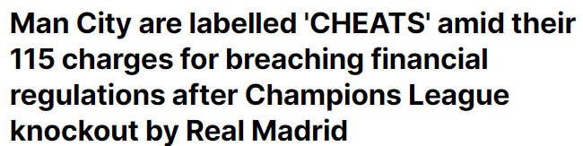 A quick Google of “Manchester City Cheats” shows that no media outlet ever accused them of cheating. They all merely said they had been charged, and what they have been charged with.
