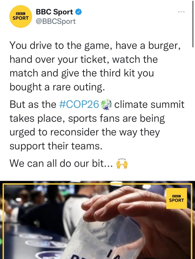 Clearly he / him was more interested in attacking match going fans rather than highlighting what football clubs, the authorities and the TV companies could do to reduce the carbon footprint of football.
